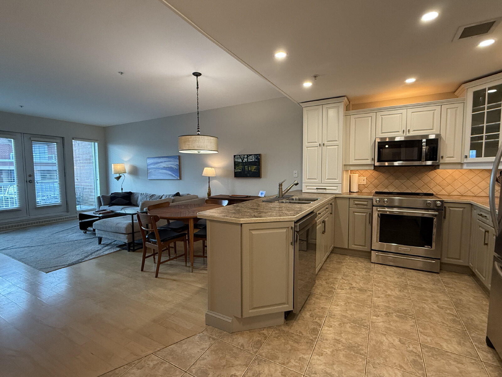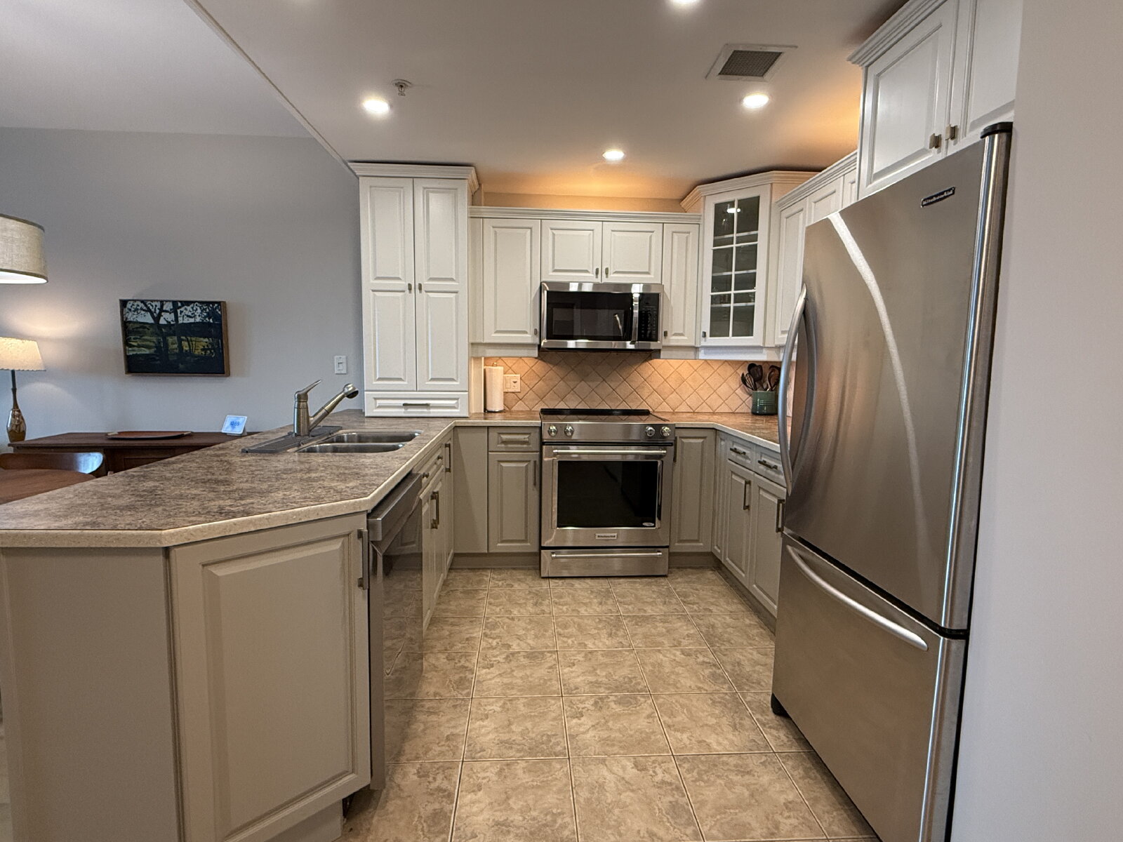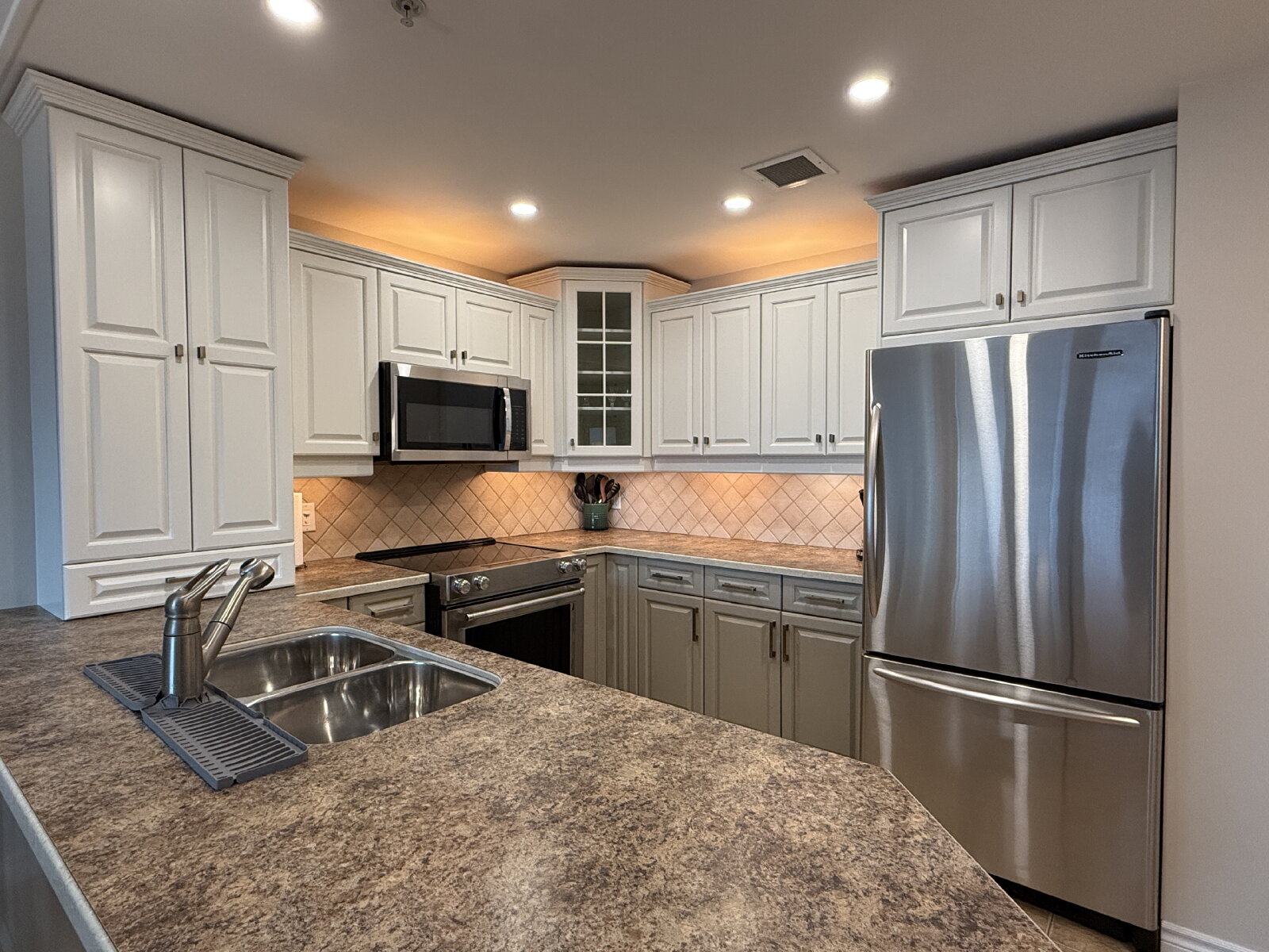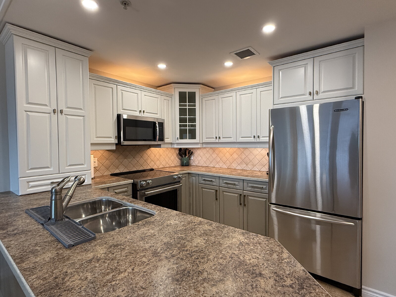- Tiled backsplash with under/over cabinet lighting